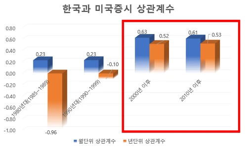 한국과 미국 증시의 상관계수 속 특징을 살펴보니