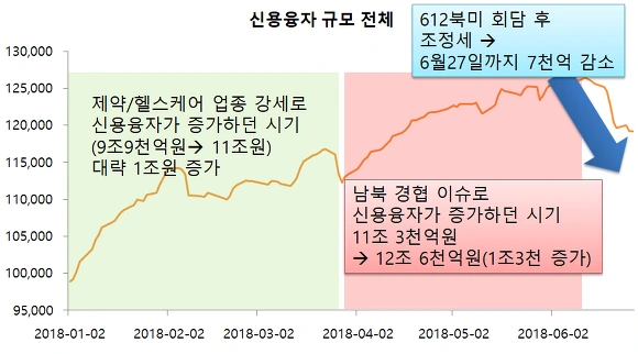 그리고 612 북미 회담 이후 이벤트 효과 소진과 함께 무역전쟁 그리고 미국 금리인상이라는 복합적인 악재가 연이어지면서 증시가 하락 압력을 받기 시작하였고, 특히 신용융자가 크게 늘어난 남북 경협 종목들의 낙폭 확대가 6월 말인 오늘까지 지속되고 있습니다.