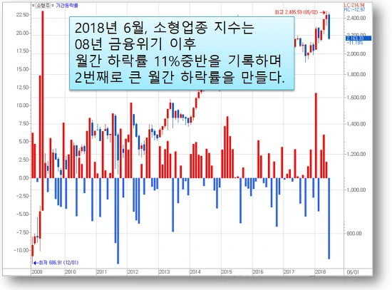 표면상 증시 하락 원인은 미국의 금리인상과 미국의 무역전쟁 때문입니다. 그렇다 하더라도 종합주가지수에 6월 하락률 4~5% 수준과 코스닥지수 하락률 8%에 비하면 소형업종 지수의 하락은 유독 큰 두 자릿수 하락률을 나타나고 있습니다.