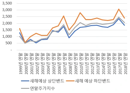 [연말 새해 증시 전망의 상단과 연말 지수의 비율 확대축소 그리고 새해 증시 결과]