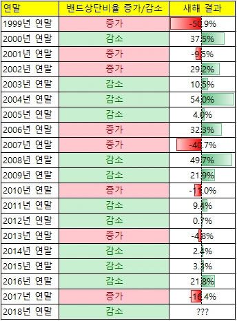 이를 토대로 전망밴드 상단과 연말 지수간의 비율 추이를 전년과 비교하여 "증가" 또는 "감소"로 기준을 만들어 보았습니다. 그리고 이 상단밴드 비율 증가/감소 후의 새해 결과치를 최종적으로 비교하였습니다.