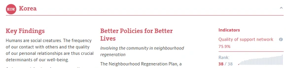 다양한 사회적 지표로 38개 국가를 평가하였는데, 이 중 한국은 사회적연계(Social Connections)지표 순위 하위권을 기록하여왔고 올해 2018년도에도 최하위를 기록하였습니다. 사회적연계는 어려움이 생겼을 때, 도움을 요청할 수 있는 친척,친구 또는 이웃이 있다고 응답한 사람의 비율로, 한국인은 75.9%를 기록하였는데, 우리가 위험한 국가로 인식되어있는 멕시코의 80.1%보다도 낮은 수준입니다. (참고로 멕시코는 우리나라 바로 앞순위입니다.)