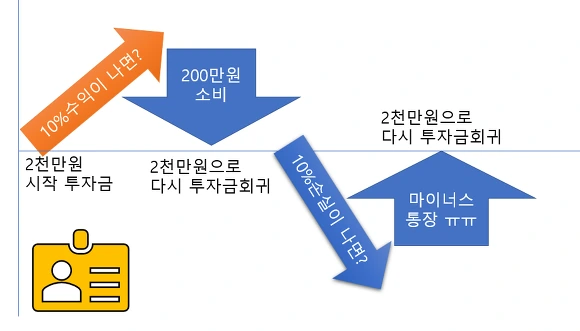 이런 과정이 반복되다보니 직장인 투자자분들의 특징 중에 주식투자금액은 일정하지만 마이너스 통장에는 가족 몰래 빚만 쌓이는 이상한 구조가 만들어집니다. 수익이 났을 때 그 돈을 허투루 녹여 써버렸다보니 반대로 손실이 발생했을 때는 빚만 누적되는 것입니다.