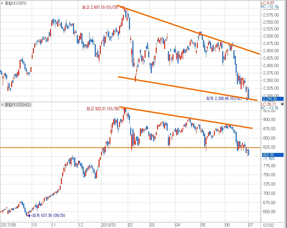 종합주가지수는 올해 고점을 낮추고, 저점을 낮추더니 올해 1월 2600p고지에서 300p 이상 내려온 2300p가 위협을 받고 있습니다. 대외적으로는 미국의 무역전쟁과 미국 연준의 매파 성향 그리고 그에 따른 이머징 국가 경제 불안이 증시에 부담을 주고 있는 가운데 국내 수급도 그리 녹녹지 않은 상황이다 보니 지난 6월 내내 증시는 무겁게 흘러왔고 그 여파가 7월 첫 거래일인 오늘도 영향을 미치고 있습니다.