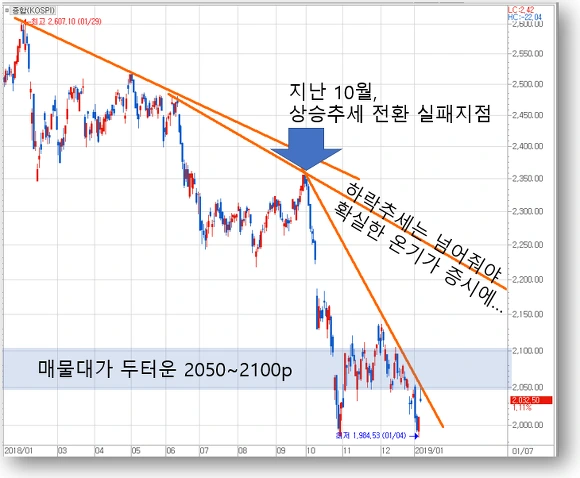 대략적으로 주가지수 2100p는 넘어주어야 작은 고비를 넘겨 살짝 미지근한 느낌이 주식시장에서 실감나기 시작할 것이고, 지난 10월 초 상승추세 전환 실패 지점에서 만들어진 하락추세를 넘어서야 시장에 대한 투자자들의 심리가 살아나면서 온기가 확실히 느껴질 수 있습니다.