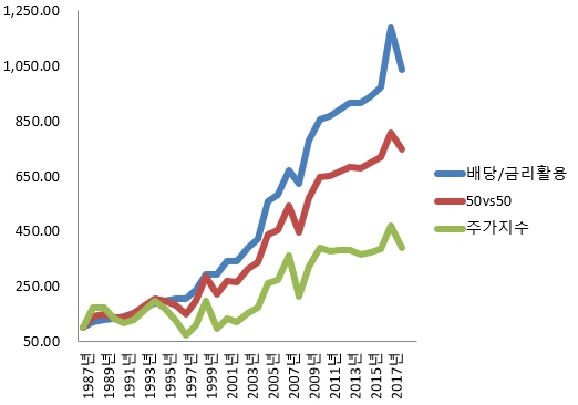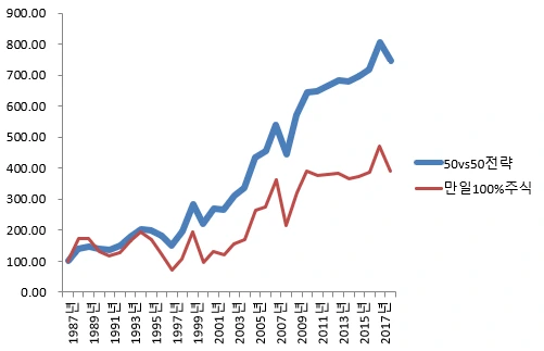 [1987년 말부터 2018년 말까지 31년간의 50대50전략의 성과, 기준가 시작 : 100]