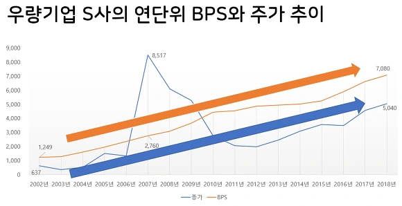 필자가 어제 강연을 다녀온 S사의 사례를 위의 도표에서 보시는 것처럼 S사는 매년 BPS가 꾸준히 증가 해 왔습니다. 2002년 연말에는 수정BPS기준 1250원 정도였고 2018년 3Q말 기준 7080원에 이르러 있습니다. 만 16여년 동안 BPS가 5.6배 증가하였던 것입니다.