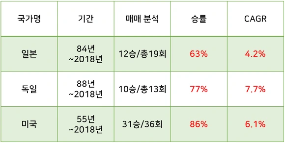 연복리 수익률보다도 눈에 띄는 것은 승률입니다. 일본의 경우 84년부터 최근까지 63%의 승률, 독일은 88년부터 최근까지 77%의 승률, 미국은 55년부터 최근까지 86%의 승률이라는 제법 높은 성과를 만들었습니다.