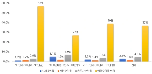 위의 자료는 90년대부터 최근까지 10년 단위로 구간을 나누어 종합주가지수 기준 시세차익을 연환산하고, 배당수익률을 연환산한 값과 이를 더한 총투자수익률 그리고 해당시기 배당수익률이 총투자수익률에서 차지하는 비중을 함께 표시한 도표입니다.