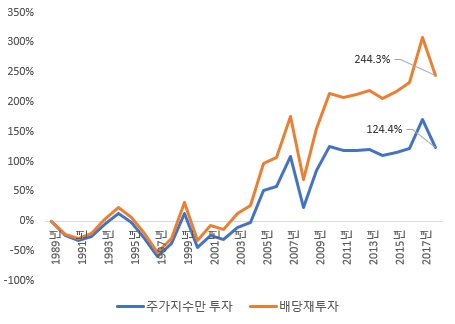 위의 자료에서는 1989년말부터 2018년 말까지 29년간의 종합주가지수만 기준으로 하였을 때의 수익률(청색선)과 여기에 더하여 배당금을 재투자하였을 때의 수익률(주황색선,배당재투자)을 표시하고 있습니다.