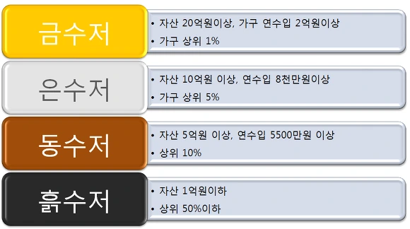금수저의 기준인 자산 20억원 이상은 대한민국 가구의 상위 1% 순자산의 근사치이고, 은수저의 순자산 10억원은 상위 5%, 동수저의 순자산 5억원은 상위 10% 그리고 순자산 1억원 이하는 상위 50%이하를 의미하고 있습니다. (※ 2019년 현재는 위의 기준보다 10~20% 상승했을 것입니다.)
