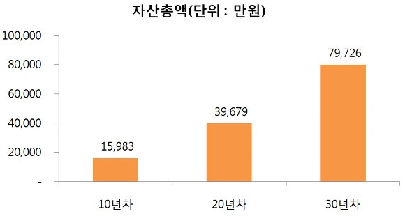 처음 10년은 그 증가속도가 답답하게 느껴질 수 있습니다. 하지만 시간이 흘러갈 수록 복리의 효과가 가속화되면서 20년차에는 3억9천만원, 30년차에는 8억원의 자산을 만들게 됩니다. 연 5%수익률을 30년간 추구했을 때 말입니다.