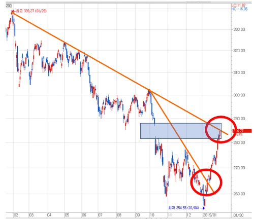 1월 9일 양봉을 그리면서 상승추세로 살짝 진입할 때가 시작점으로 평가될 수 있기는 하지만 그 당시는 언제든지 다시 무너질 수 있는 불안감을 가지고 있었지요. 하지만 이번 상승이 이어져 갭이 만든 창을 모두 닫게 된다면 당장에 코스피200 지수에서는 작년 1월, 5월, 9월 고점의 연결선상의 하락추세를 넘어서게 됩니다. 그러고보니 오늘 코스피200에서는 그 추세선을 넘어설 것인지에 대한 공방이 치열하군요.