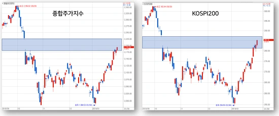 종합주가지수는 어느 사이엔가 2200p에 육박하며 갭하락으로 만든 창을 많은 부분 닫기 시작하였고, 코스피200 지수에서는 이미 갭하락의 중앙이라 할 수 있는 285p를 넘어서면서 갭하락의 창을 절반이상 닫았습니다.