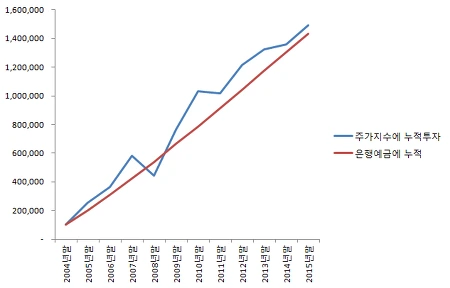 이 돈을 주가지수에 투자한 경우 총액은 149만여원, 은행에 예금 또는 적금한 경우는 143만원의 평가금액을 2015년 말에 기록하고 있습니다. 주가지수에 투자한 경우가 몇만원 정도 더 이익이 붙었습니다.