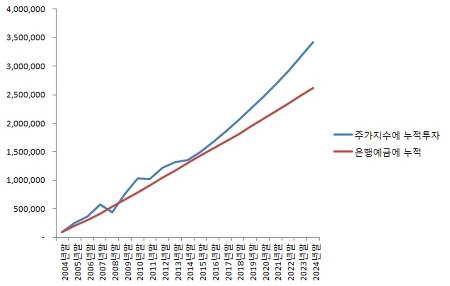 이 때, 주가지수의 연상승률은 장기평균 5%정도로 보수적으로 잡아보았으며 은행이자는 2%로 가정하였습니다.(한국의 주가지수 장기 연평균수익률은 5~12% 수준입니다.)