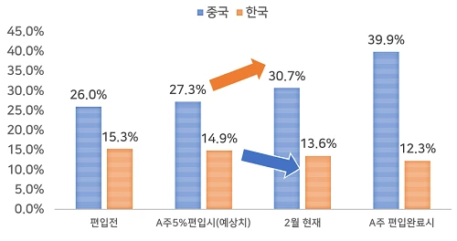 그 당시는 전체 스케쥴에서 5%진행한다고 하였습니다. 그런데 그 시기 분석된 자료에 따르면 중국A주 편입 스케쥴에 5%가 완료될 경우 MSCI이머징 지수내 중국 비중은 26%에서 27.3%로 높아지고 한국 비중은 15.3%에서 14.9%로 낮아진다고 추정되었습니다.