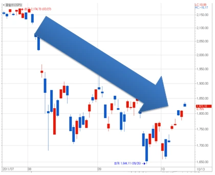 바로 2011년 8월 유럽 위기가 바로 그것입니다. 유럽 위기의 하락장은 가을까지 지속되면서 투자자들을 혼란에 빠트렸습니다. 특히나 그 직전 "차화정 랠리" 속에 자동차, 화학, 정유 종목을 안사면 바보 취급받기도 하였던 차별화 장세가 있었기에 많은 이들이 차화정에 집중 투자한 경우가 대부분이었습니다.