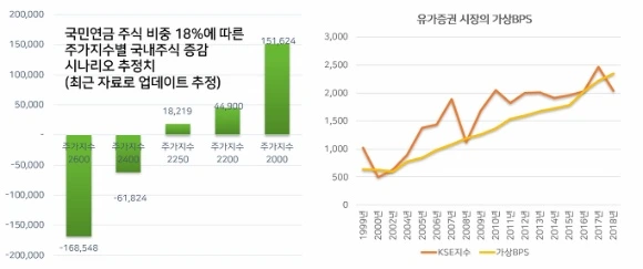만약 증시가 현재 주가지수대인 2200p에서 제자리 걸음을 할 경우 시장BPS의 꾸준한 증가세로 인해 깊은 저평가 영역에 들어가있기에 증시가 더 하락한다면 국민연금을 중심으로한 연기금의 자산배분전략에 의한 매수세가 갑자기 유입되면서 증시에 든든한 언덕이될 수 있습니다. 그러하기에 적당한 수준에서 완만한 증시 상승세가 장기적으로 이어졌을 때 시장 참여자들 대부분에게 투자 성과를 안겨줄 수 있는 증시가 만들어질 수 있습니다.