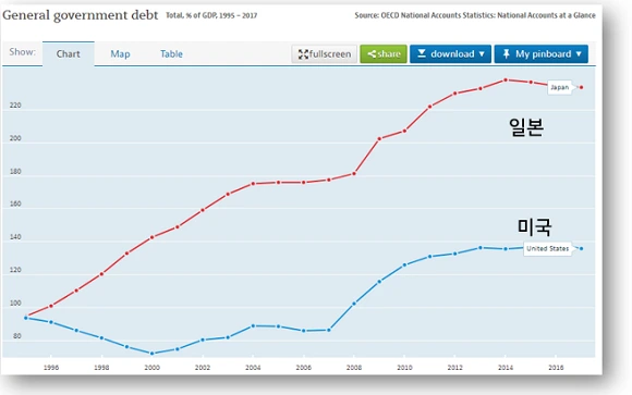 [일본과 미국의 GDP대비 국가부채 비율 추이, 자료참조 : OECD]