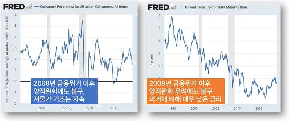 대표적으로 MMT이론이 급부상하는 미국의 경우를 볼 수 있겠습니다. 2008년 금융위기 이후 양적완화 과정에서 미국 정부는 열심히 국채를 발행하였고 이를 연준에서 매입하면서 달러를 공급하였습니다. 양적완화 초반에는 차후에 발생할 인플레이션 우려가 컸었습니다만, 아이러니하게도 미국은 경제가 안정되어가는 과정에 물가가 앙등하지 않고 오히려 저물가 기조가 이어졌습니다.