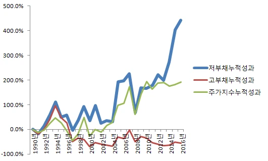 가장 먼저, 이 부채비율을 토대로 저부채비율 100종목과 고부채비율 100종목을 선정하여, 1990년 말부터 포트폴리오를 세팅하고 1년에 한 번씩 종목을 위의 기준에 맞추어 계속 교체하여가면서 1년 수익률을 누적하여 계산하여 보았습니다. 1990년 말부터 2016년 말까지 26년, 사반세기가 넘어가는 시간 동안 어떤 결과가 나올지 올라오는 데이터를 흥미롭게 관찰하였습니다. 어떤 시기에는 부채비율이 높은 종목군이 오히려 높은 성과를 만들기도 하는 등 예상과 다른 결과값이 관찰되기도 하였습니다.