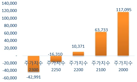위의 표는 주가지수 2000p에서 2300p까지 주요 구간별로 국민연금이 국내주식 비중 18%를 맞추기 위한 올해 상반기 말까지 매매해야할 추정치를 필자가 계산한 자료입니다.