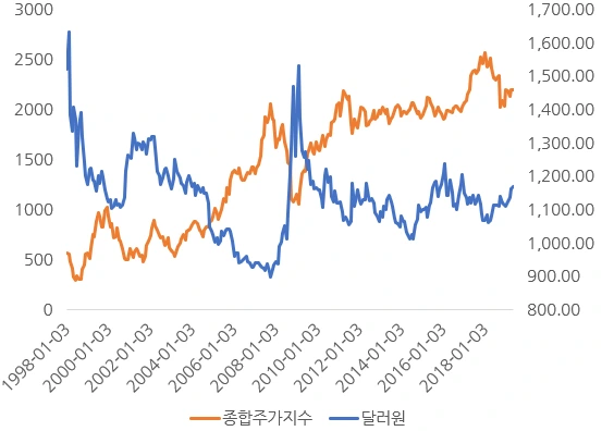 [1998년 이후 달러원환율과 종합주가지수 추이, 좌축:종합주가지수/우축:달러원]