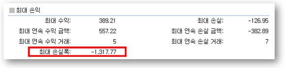 위의 종합주가지수에 특정 지표로 시뮬레이션한 결과를 보게되면 순간적일 수 있지만 MDD가 1317p가 발생하였다는 것을 확인할 수 있습니다.