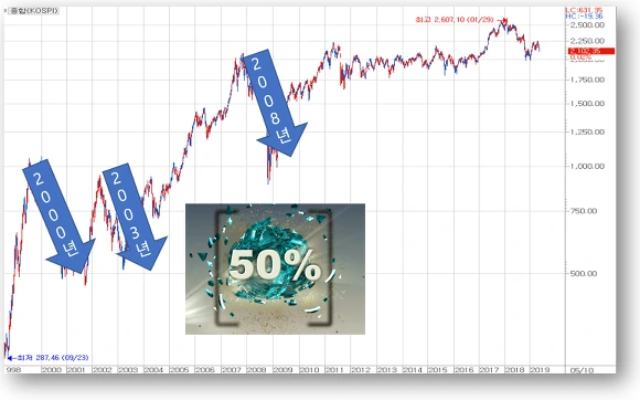-50%... 살벌하지요? 주가지수가 반토막 나는 것이니 말입니다.