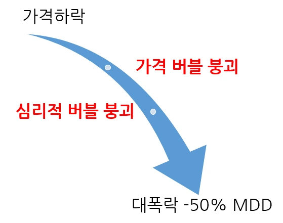 버블이 있는 증시 또는 업종이 조정장이 발생할 때에는 일단 가격버블이 꺼지고 심리적 버블이 꺼지는 2단계의 하락이 발생하기에 -50%이상 MDD를 기록하는 증시 상황이 만들어지게 됩니다.