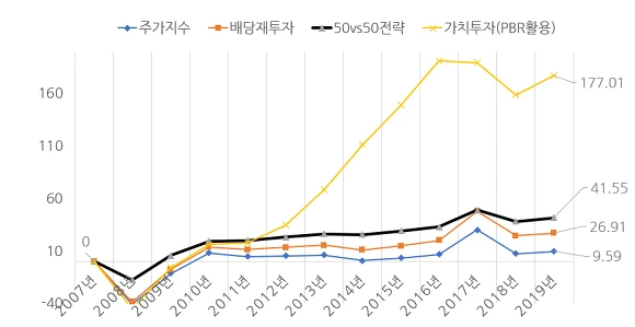 같은 기간 2007년부터 현재까지 가치투자 방법의 수익률은 누적 177%를 기록하였고 이는 연환산 9.2%라는 성과입니다(배당 미포함). 만약 배당수익률까지 재투자하였다면 연 10%이상의 누적성과를 기록하였을 것입니다. 여기에 조금 더 다듬어진 가치투자 방법의 경우는 이보다 훨씬 높은 성과가 나타나기에 혹시나 오해가 생길까 싶어 수익률이 뒤쳐진 가치투자 방법의 성과만 보여드립니다.