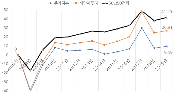 주가지수가 12년여 동안 제자리 걸음만 걸은 듯하지만, 이렇게 배당재투자 그리고 50vs50전략으로 보더라도 수익률은 계속 꾸준히 앞으로 나아갔음을 확인할 수 있습니다.