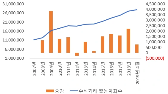 [2007년 이후 활동계좌수 추이, 자료 : 금융투자협회]