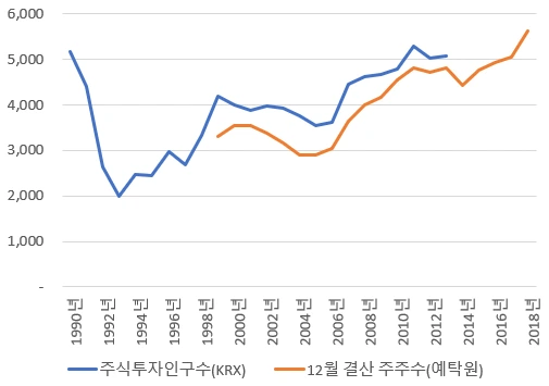 ㅇ 주식투자 인구수 또는 12월 결산 주주수 증시 등락에 따라 변해왔는데.