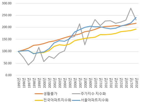 1996년 연초 100으로 잡을 경우 생활물가지수는 2018년 연말 현재 216.36 으로 23년여간 116.36%상승하였고 연평균 3.4% 증가하였습니다. 같은 기간 전국 아파트지수와 서울 아파트지수 또한 생활물가를 따라 상승하였습니다. (자료참조 :KB부동산)