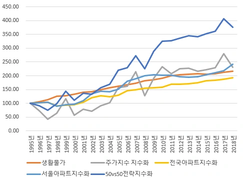 위의 표는 앞서 언급드린 96년 초부터 2018년까지 23년간의 생활물가, 주가지수, 전국아파트지스, 서울아파트 지수를 96년 연초를 100으로 잡고 비교한 도표에 50vs50 자산배분전략을 추가한 결과치입니다.