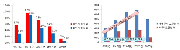 이에 대한 답은 2007년 11월 KRX(한국거래소)에서 있었던 공청회 자료에서 찾을 수 있습니다. 당시 공청회에서 발표된 "KRX 가격제한폭제도의 유효성에 관한 연구(한국증권 연구원 엄경식 박사)"의 자료에 따르면, 상하한가 폭이 15% 미만이었던 시기 상하한가 빈도도 많았고, 개별주식의 변동성이 높았었다 합니다. 그에 반해 시장 전체적으로는 변동성이 축소되었음을 확인할 수 있었습니다.