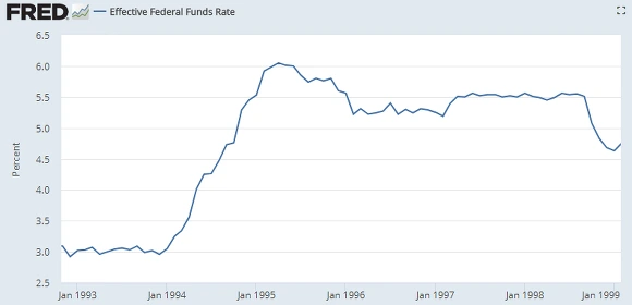1994년 당시 연준 의장인 그린스펀은 과열 조짐이 보이는 경기를 잡기 위하여 전격적인 기준금리 인상을 단행하였습니다. 지금처럼 1년에 25bp씩 4번 인상하네마네 하는 수준이 아닌 1994년 그 해에만 화끈하게 3%p 높였습니다.