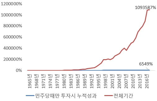 연간CAGR로는 민주당집권시기에만 투자시 8.1%, 전체 기간 투자시에는 18.8%라는 연10%p의 엄청난 차이가 이 갭을 만든 것입니다.
