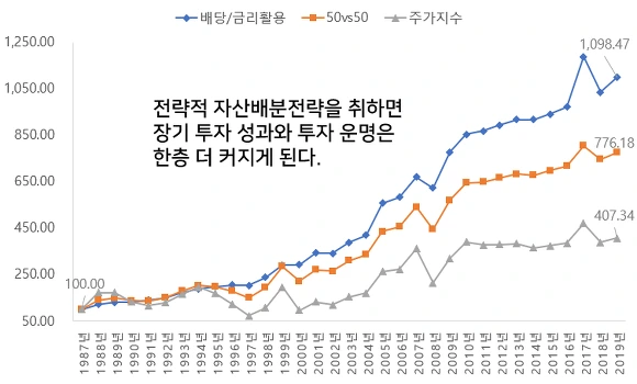 위의 도표는 1987년 기준가 100p로 시작하였다고 가정하고 아래회색선은 종합주가지수에만 투자하였을 때 그리고 중간 주황색선은 50vs50자산배분전략을 취했을 때 마지막으로 최상단은 배당/금리 활용 자산배분전략을 사용했을 때의 초장기 성과입니다.