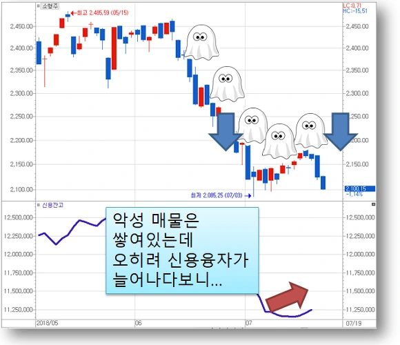 그런데, 아직도 신용융자 물량은 연초 수준까지 짜내지지 않았고 오히려 지난주 반등 속에 되려 신용융자 금액이 1천억원 증가하였습니다. 어설프게 증가한 신용물량이 또 다시 악성 매물로 시장에 쏟아지는 것이지요.