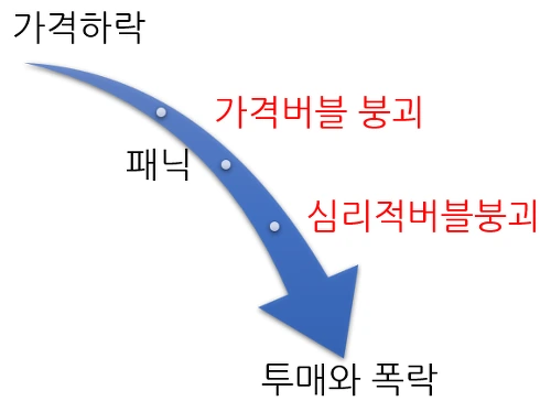 [버블의 붕괴 과정, 가격 버블이 붕괴되면 심리적 버블이 붕괴되고 패닉에 빠진다.]