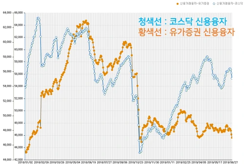 코스닥지수는 작년 늦가을 급락장이 있기 직전에 비해 현재 18%가까이 하락한 상황인데 반하여 신용융자 규모는 작년 9월말 10월 초 수준에 위치해 있습니다. 지난 봄사이 신용융자 급증 과정에서 개인투자자가 무리한 베팅을 한 것이 아닌가 우려스럽더군요.