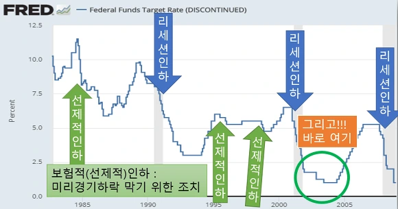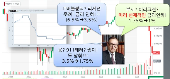 2000년대 초반 연준의장은 그린스펀의장이었지요. 2000년 이후 IT버블이 붕괴될 때 급하게 리세션 금리인하를 단행하였는데, 911테러와 이라크전쟁이 발생하면서 경기의 급격한 침체를 막기 위한 이유로 보험성격의 선제적 인하를 단행하였습니다. 즉, 리세션인하에 연이어 선제적 인하가 등장한 것입니다.