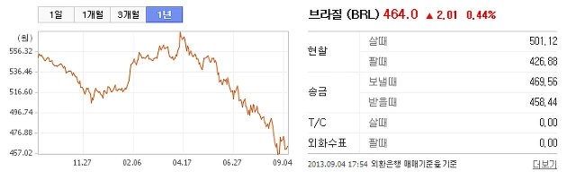 [2013년 중순 원화 대비 브라질 헤알화 추이, 하락세가 고착화되었는데...]
