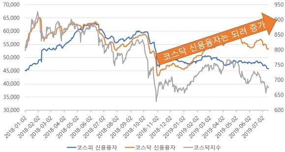 [코스닥 시장의 신용융자는 작년 가을 대비 오히려 증가하였다]