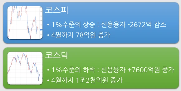 굳이 명분을 찾자면 올해 초 4월까지 코스닥지수가 두자리수 상승이 있었다는 점을 들 수 있습니다. 그 시기 올해 4월 말까지 코스닥지수가 11%수준의 상승세를 만드는 동안 코스닥 시장에서의 신용융자는 1조2천억원 증가하였습니다. 그에 반하여 코스피 시장에서는 78억원만 신용융자가 증가했을 뿐입니다.