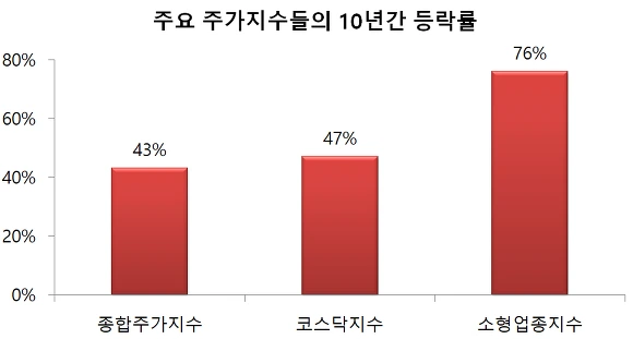 요즘 투자자들의 심리를 그렇게도 뒤흔든 소형업종지수의 경우는 10년간 76%상승하였습니다.