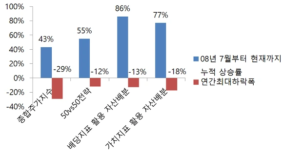 (2008년 7월 말~2008년 12월 폭락장에서 주가지수는 -29%하락, 50vs50전략은 -12%정도만 하락하였습니다.)